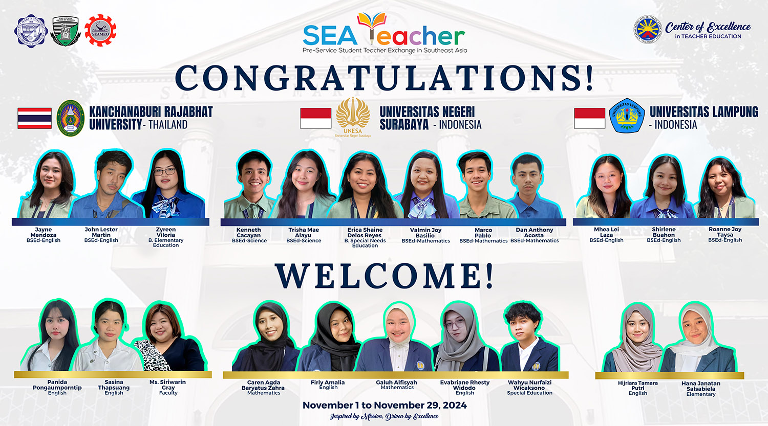 Twelve Marian pre-service teachers embarked on international practicum experiences in Indonesia and Thailand. In Thailand, three Bachelor of Secondary Education (BSEd) students majoring in English – Jayne Mendoza, John Lester Martin, and Zyreen Viloria – are gaining teaching experience at Kanchanaburi Rajabhat University. Meanwhile, in Indonesia, six students are immersing themselves in the academic environment of Universitas Lampung and Universitas Negeri Surabaya. Shirlene Buahon, Mhea Lei Laza, and Roanne Joy Taysa, BSEd English majors, went to Universitas Lampung. Meanwhile, Trisha Mae Alayu and Kenneth Cacayan—BSEd Science Majors; Valmin Joy Basilio, Marco Pablo, and Dan Anthony Acosta—BSEd Mathematics Majors; and Erica Shane Delos Reyes—Special Needs Education Major were assigned to Universitas Negeri Surabaya.