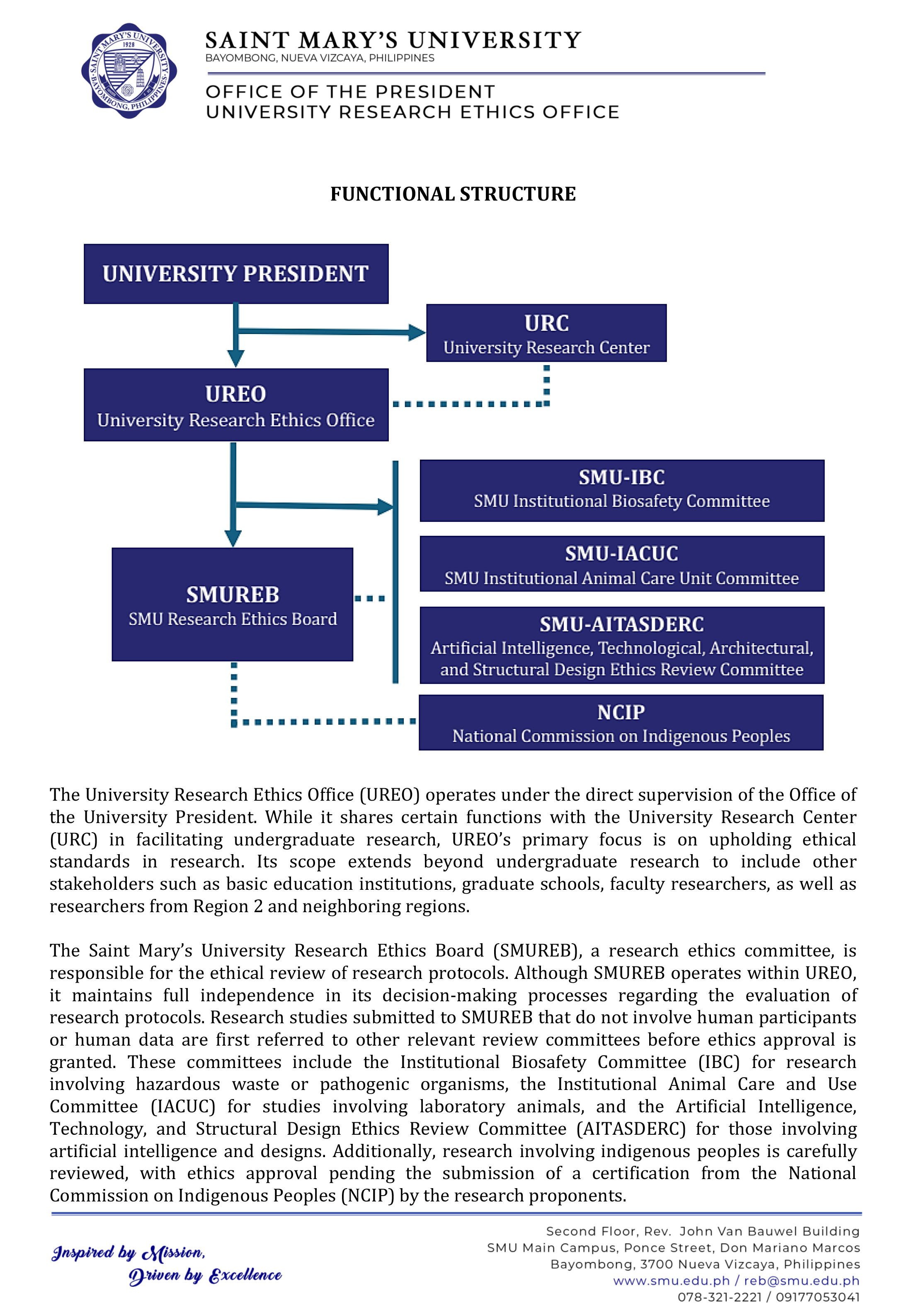 On August 1, 2022, the UREO (University Research Ethics Office) was established as a junior administrative unit with a dedicated office staff. The functions and responsibilities of the UREO head include (1) capacitation of faculty and students to become ethical researchers; (2) development of ethics guidance and processes for incorporation into the policies/guidelines of the University Research Center and the School of Graduate Studies; (3) ensuring that the culture of research ethics is sustainable and fully imbibed by the Marian community, and; (4) serving as chair of the institutional research ethics committee (SMUREB). The SMUREB is independent in its decision-making, and while it is allied to the University Research Center, it is directly under the office of the University President. The SMUREB is housed in the UREO, along with the other institutional ethics review committees, namely the SMU-IACUC (Institutional Animal Care and Use Committee), SMU-IBC (Institutional Biosafety Committee), and AITASDERC (Artificial Intelligence, Technological, Architectural, Structural Design Ethics Review Committee).
