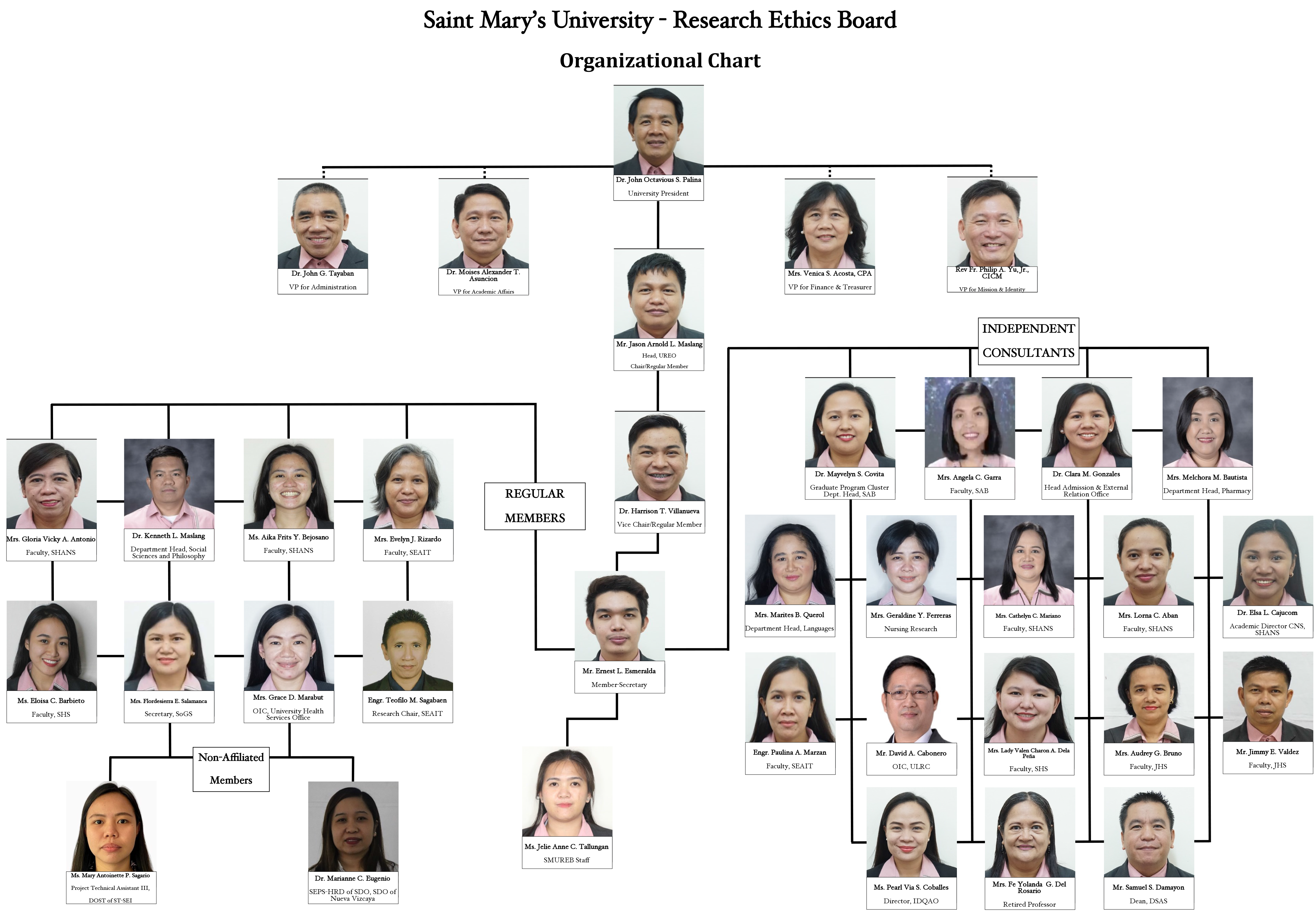 In relation to the vision-mission of Saint Mary’s University, SMUREB is established as an institutional research ethics review committee to ensure that the research of students and faculty adhere to national and international guidelines as part of the integral formation of persons exemplifying excellence and innovation. The review process guarantees that research is ethically sound with scientific merit and social value. The committee looks forward to catering to other researchers in the region as a conscious effort to strengthen communion with other research institutions.